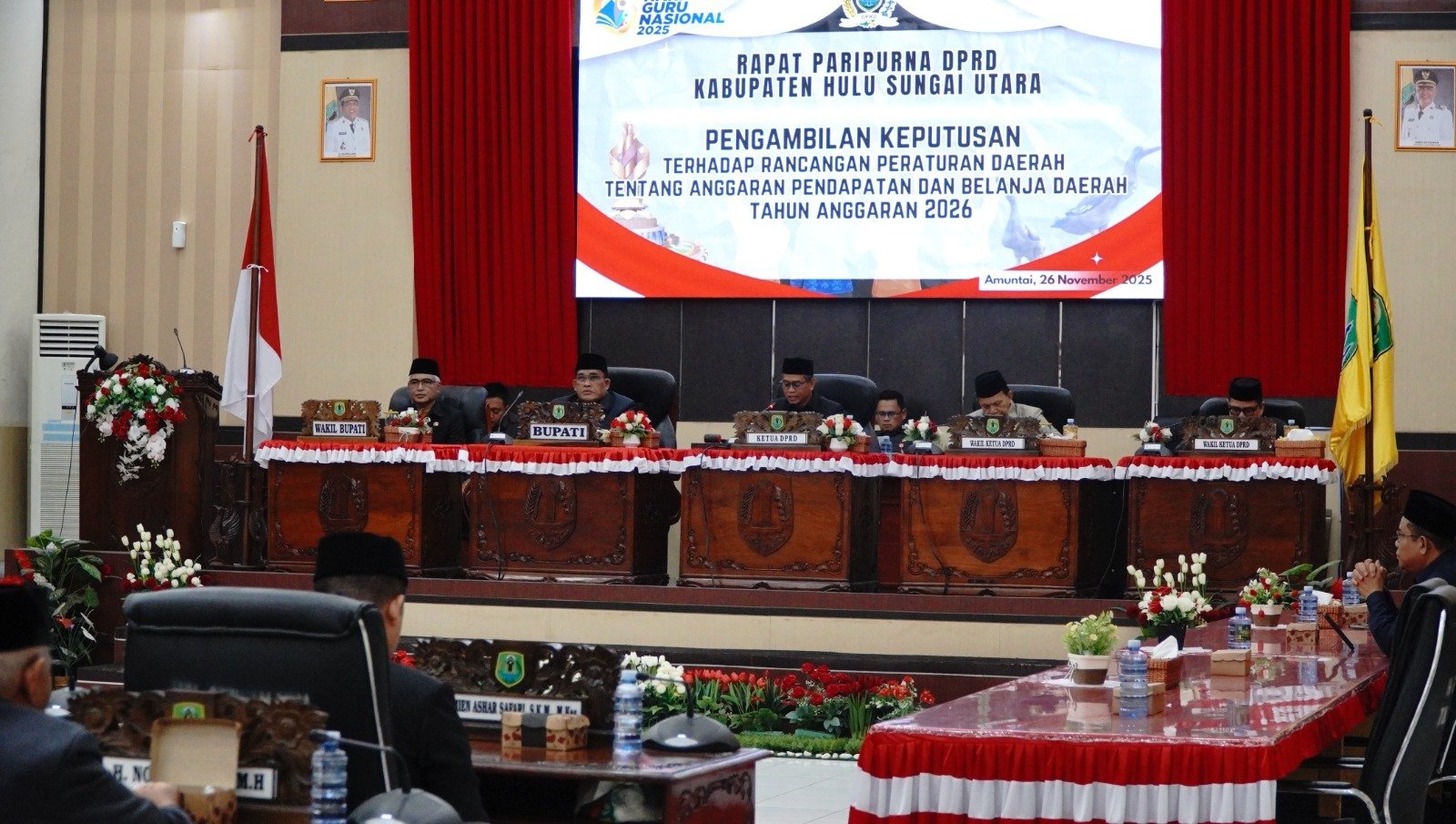 Rapat paripurna tersebut dipimpin langsung oleh Ketua DPRD HSU dan dihadiri unsur Forkopimda, kepala SKPD, serta tamu undangan lainnya. Agenda utama rapat adalah penyampaian pendapat akhir fraksi-fraksi DPRD sekaligus pengambilan keputusan terhadap Raperda APBD Tahun Anggaran 2026 yang selanjutnya ditetapkan menjadi Peraturan Daerah.