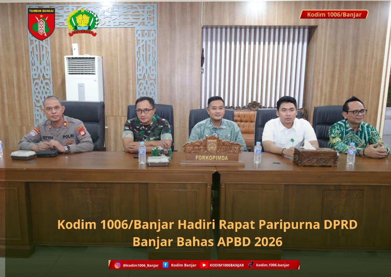 BANJAR – Kodim 1006/Banjar melalui Kapten Inf Teguh Wibowo, menghadiri Rapat Paripurna DPRD Kabupaten Banjar Tahun 2025 yang berlangsung di Gedung DPRD Banjar, Kamis (20/11/2025). Rapat dipimpin Ketua DPRD Banjar H. Agus Maulana, S.H., serta dihadiri Bupati Banjar H. Saidi Mansur, unsur Forkopimda, jajaran SKPD, anggota DPRD, dan perwakilan media.
