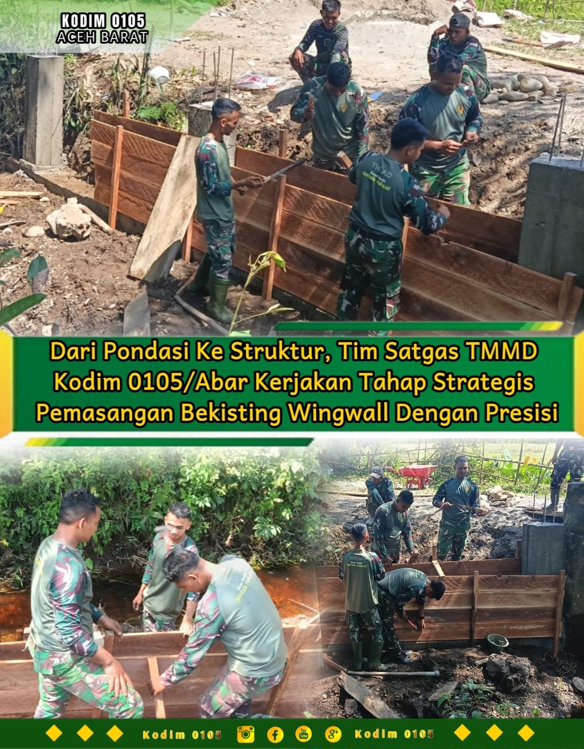 ACEH BARAT – Tahapan strategis pembangunan fisik pada program TMMD Reguler ke-127 Kodim 0105/Abar kini memasuki pemasangan papan mall wingwall di Desa Pasi Aceh, Kecamatan Woyla, Selasa (24/2/2026).