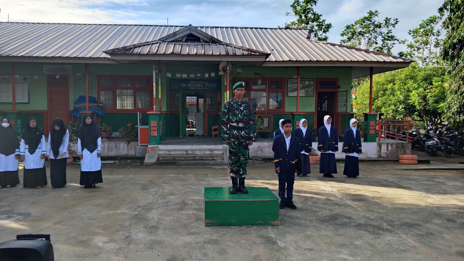 ACEH JAYA – Danramil 01/Jaya Kodim 0114/Aceh Jaya Kapten Inf Yudi Sawal yang diwakili Serka Teguh Subiyantoro menghadiri undangan sebagai pembina upacara di MTsN 2 Jaya, Desa Leupe, Kecamatan Jaya, Kabupaten Aceh Jaya Senin (24/11/2025). Kehadiran perwakilan Koramil ini menjadi bagian dari upaya pembinaan karakter generasi muda di lingkungan sekolah.