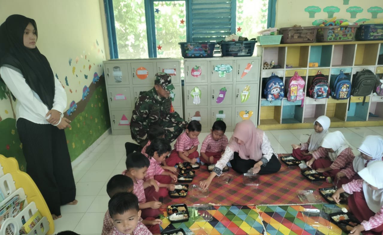 Sabang – Babinsa 04 Gampong Krueng Raya Koramil 02/Sukakarya Kodim 0112/Sabang, Sertu Hendra, melaksanakan pendampingan pada kegiatan pembagian makanan bergizi dalam rangka Gerakan Bersama Cegah Stunting Program Dana Desa TA 2025. Kegiatan ini berlangsung di TK Negeri 8 Rimba Raya, Jurong Ilham Syukuran, Ujung Sekundo, Gampong Krueng Raya, Kecamatan Sukakarya, Kota Sabang, Kamis (11/12).
