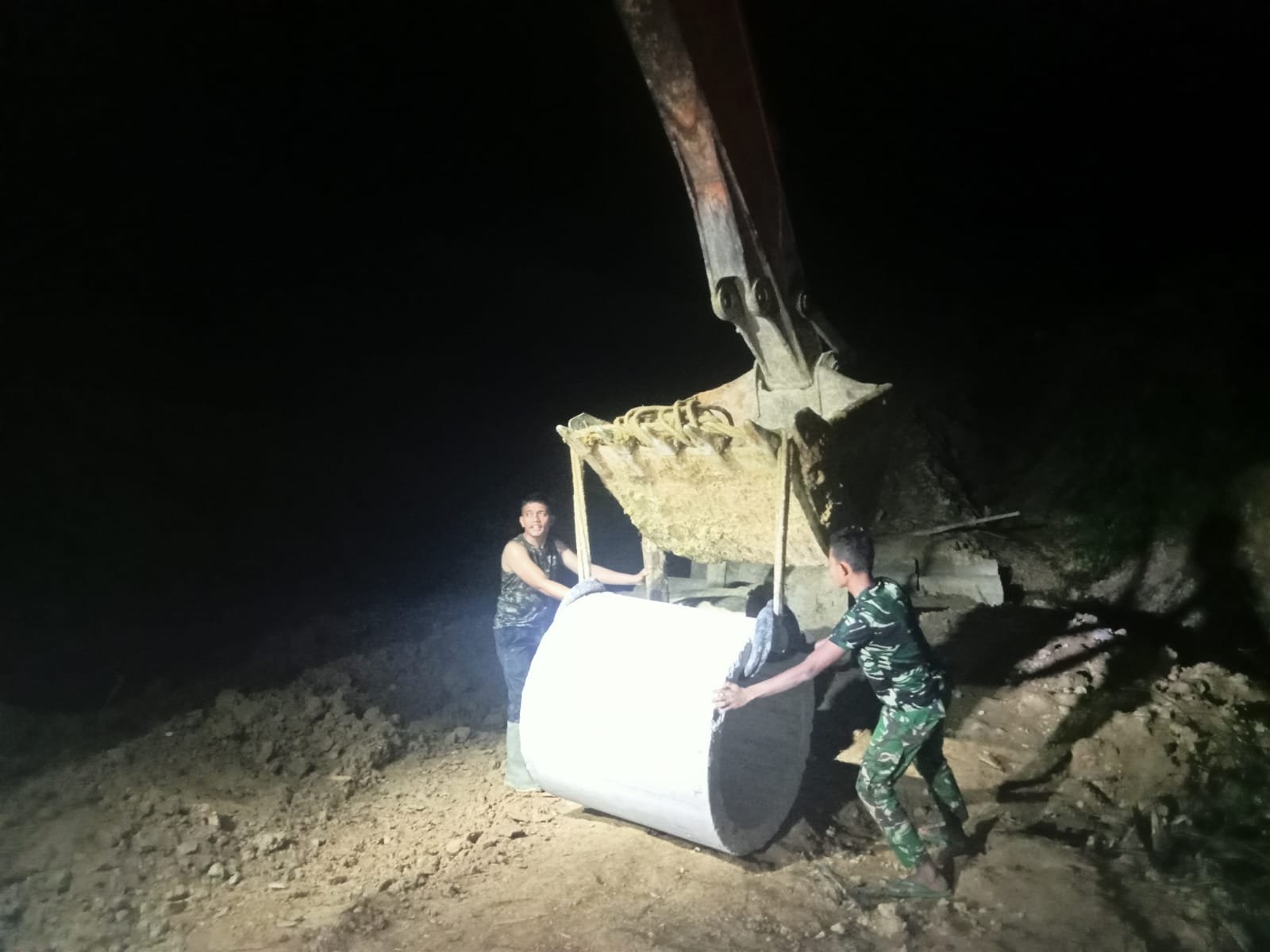 Meski hari telah gelap, aktivitas di lapangan tetap berlangsung dengan penuh semangat. Cahaya lampu kerja menjadi penerang bagi para prajurit yang sedang menggeser gorong-gorong menggunakan tali tambang besar.