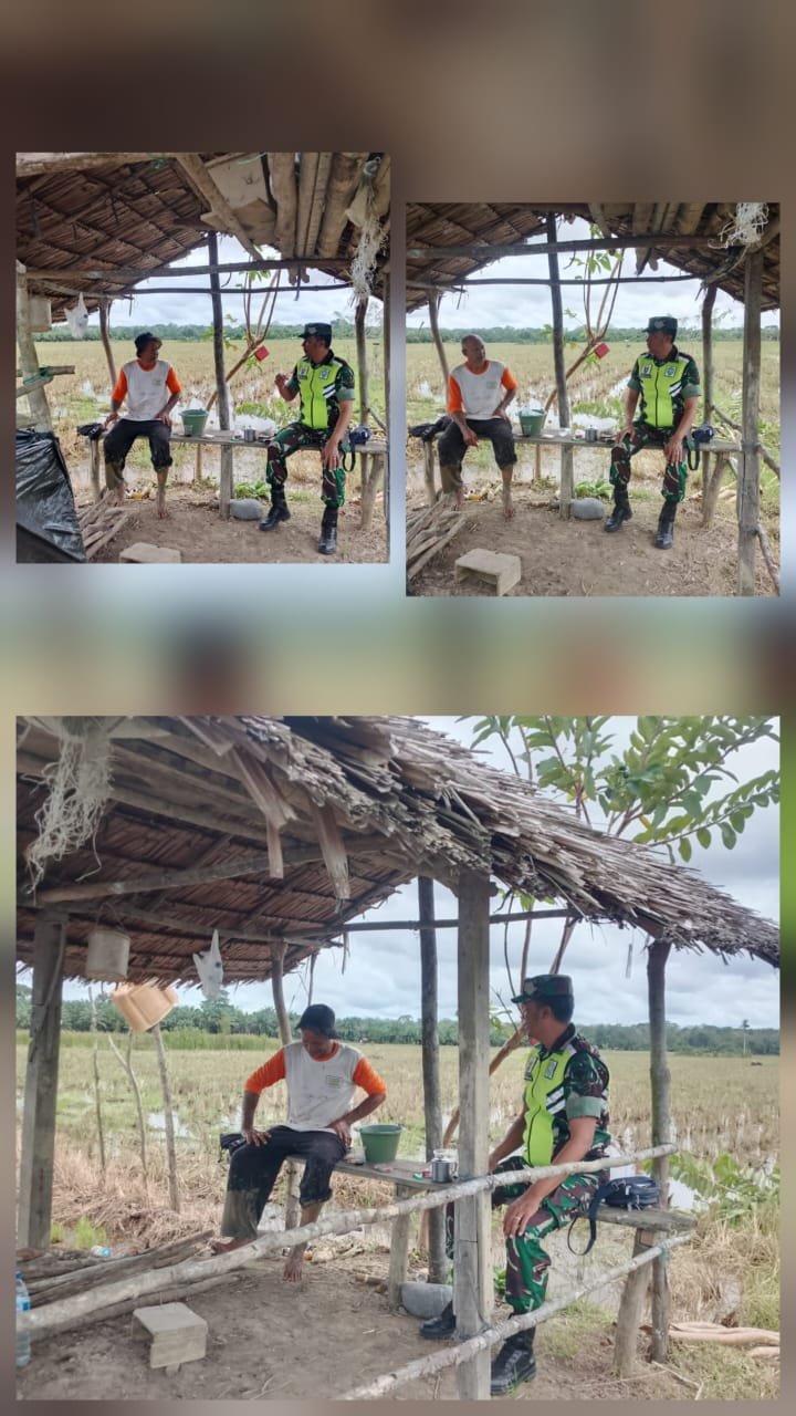 ACEH BARAT — Babinsa Koramil 02/Woyla Kodim 0105/Aceh Barat, Sertu M. Dahlan, melaksanakan Komunikasi Sosial (Komsos) dengan petani padi yang sedang beristirahat di sawah tepatnya di Desa Aron Baroh, Kecamatan Woyla, Kabupaten Aceh Barat, Sabtu (06/12/2025).