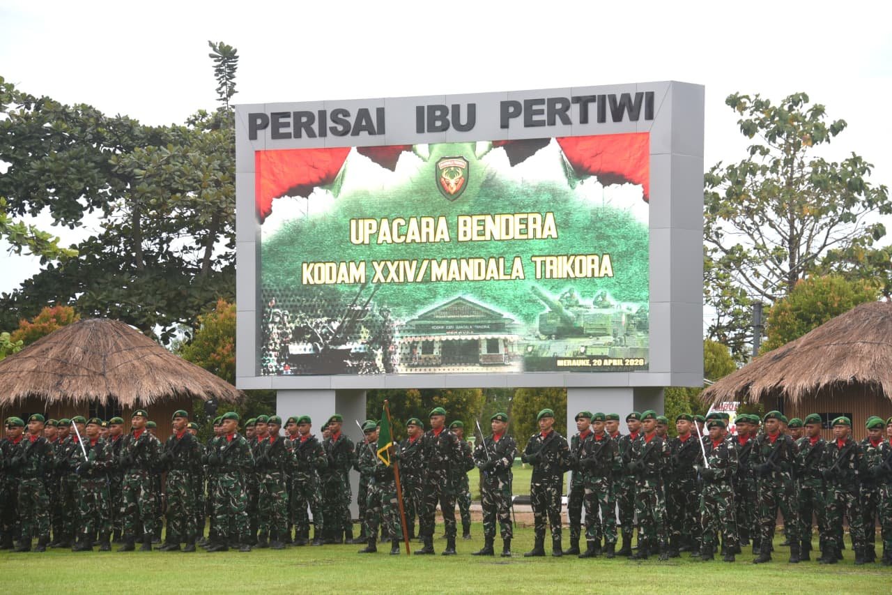 MERAUKE – Pangdam XXIV/Mandala Trikora Mayjen TNI Frits Wilem Rizard Pelamonia, S.E., memimpin langsung pelaksanaan Upacara Bendera 17-an yang berlangsung khidmat pada Senin (20/04/2026) di Lapangan Upacara Makodam XXIV/MT, Jalan Poros Tanah Miring, Kabupaten Merauke, Provinsi Papua Selatan. Upacara tersebut turut diikuti oleh Kasdam XXIV/MT Brigjen TNI Eventius Teddy Danarto, Irdam XXIV/MT Brigjen TNI Dwi Endrosasongko, S.Sos., M.I.P., para Asisten Kasdam, serta para Dan/Kabalakdam XXIV/MT.