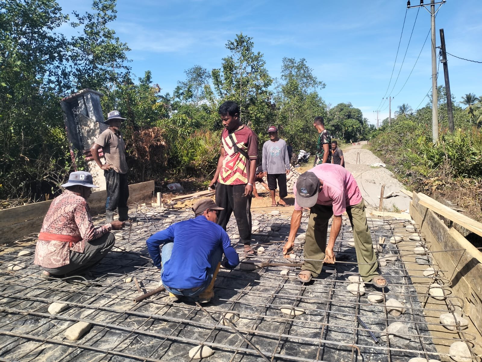 Pemasangan rangka pengecoran ini merupakan tahapan krusial guna memastikan kekuatan dan ketahanan jembatan saat difungsikan nantinya. Meski di bawah terik matahari, proses pekerjaan tetap berlangsung dengan penuh semangat dan kebersamaan.