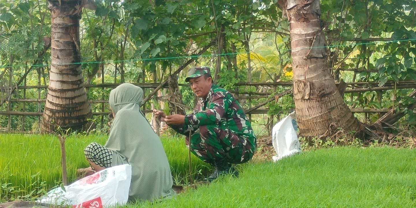 ACEH BARAT — Babinsa Koramil 04/Mrb Kodim 0105/Abar, Serda Dadang Fariza, tidak mengenal waktu dan tanpa ragu turun ke lahan pertanian guna membantu petani mencabut bibit padi siap tanam di Desa Peunaga Pasi, Kecamatan Meureubo, Senin (10/11/2025).