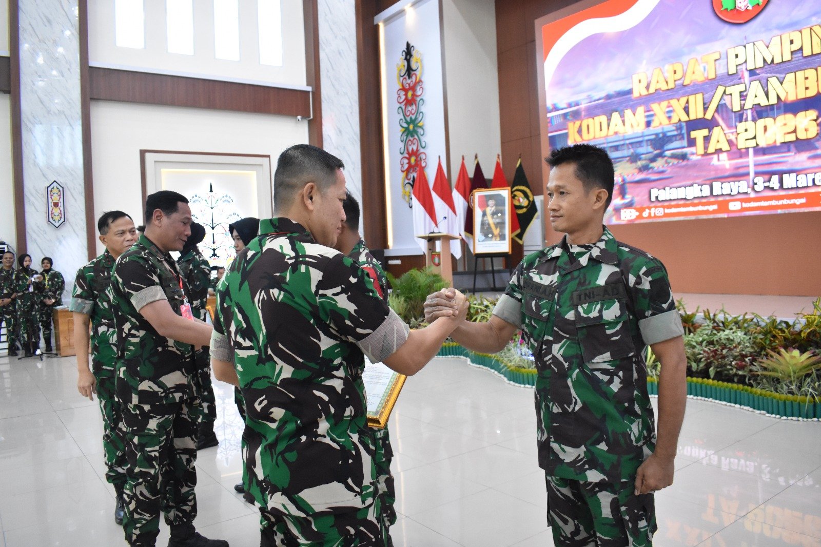 Palangka Raya – Pada kesempatan Rapat Pimpinan (Rapim) Kodam XXII/Tambun Bungai TA 2026, Pangdam XXII/TB, Mayjen TNI Zainul Arifin, memberikan penghargaan kepada para prajurit berprestasi sebagai bentuk apresiasi atas dedikasi dan kinerja, sekaligus untuk memotivasi seluruh jajaran agar terus berinovasi dan memberi dampak nyata bagi masyarakat.