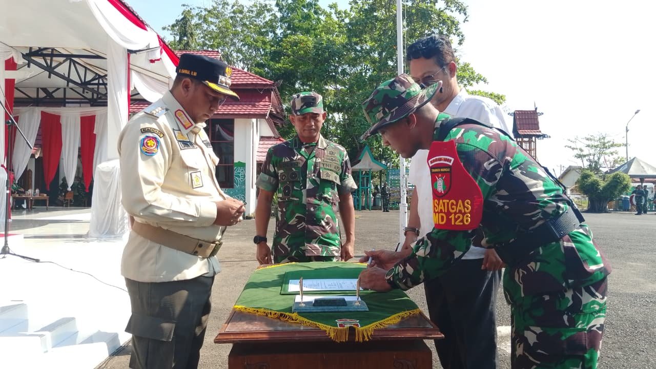 Acara dilanjutkan dengan penandatanganan naskah kerja antara Dandim 1005/Btl Letkol Inf Andika Suseno S.I.P dan Plt. Kadis PU Ahdiat Sabari, S.T., serta penyerahan alat kerja dan bantuan sembako simbolis.