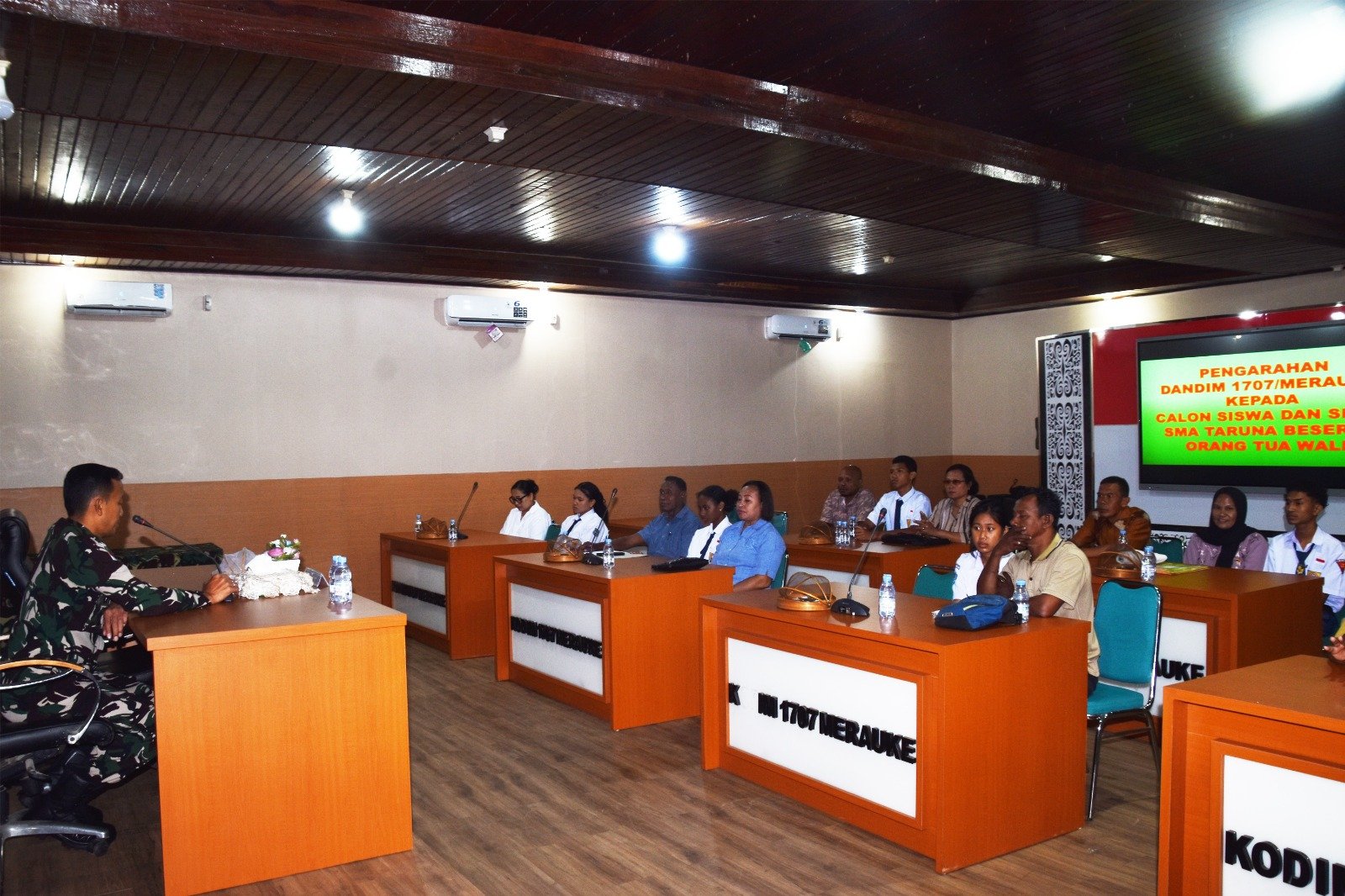 Merauke – Suasana hangat dan penuh harapan mewarnai kegiatan pengarahan kepada calon siswa-siswi SMA Taruna Nusantara yang digelar pada Selasa pagi (7/4/2026) di Ruang Data Makodim 1707/Merauke, Jln. Raya Mandala, Kabupaten Merauke – Provinsi Papua Selatan. Kegiatan dipimpin langsung oleh Dandim 1707/Merauke Letkol Czi Dili Eko Setyawan, S.Ak., M.Han.