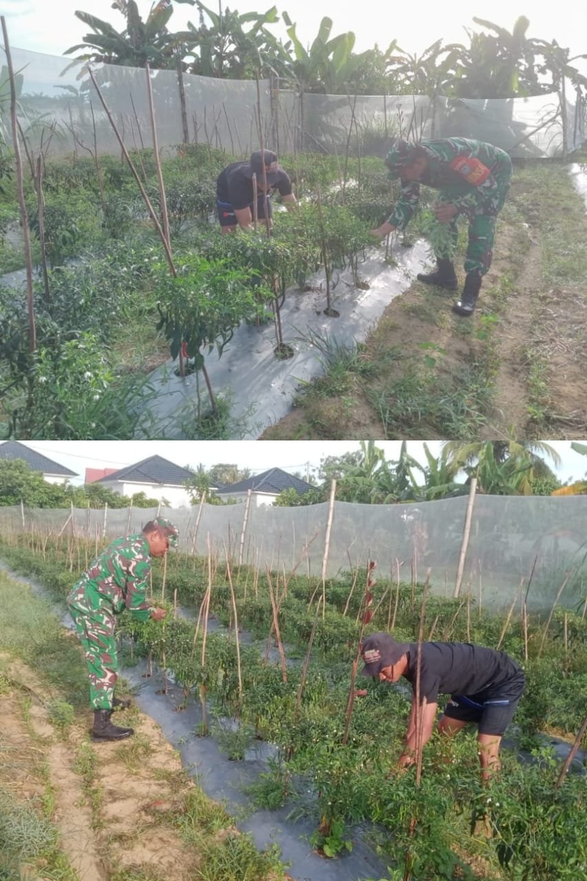 ACEH BARAT — Guna membangkitkan perekonomian masyarakat agar memiliki ketahanan pangan yang kuat, Babinsa Koramil 04/Mrb Kodim 0105/Aceh Barat, Serma Pujianto, mengorbankan hari libur serta waktu luangnya untuk mengabdikan diri membantu dan mendampingi petani dalam aktivitas merawat tanaman cabai merah yang berlokasi di Desa Ujong Tanjong, Kecamatan Meureubo, Kabupaten Aceh Barat, Jumat (16/01/2026).