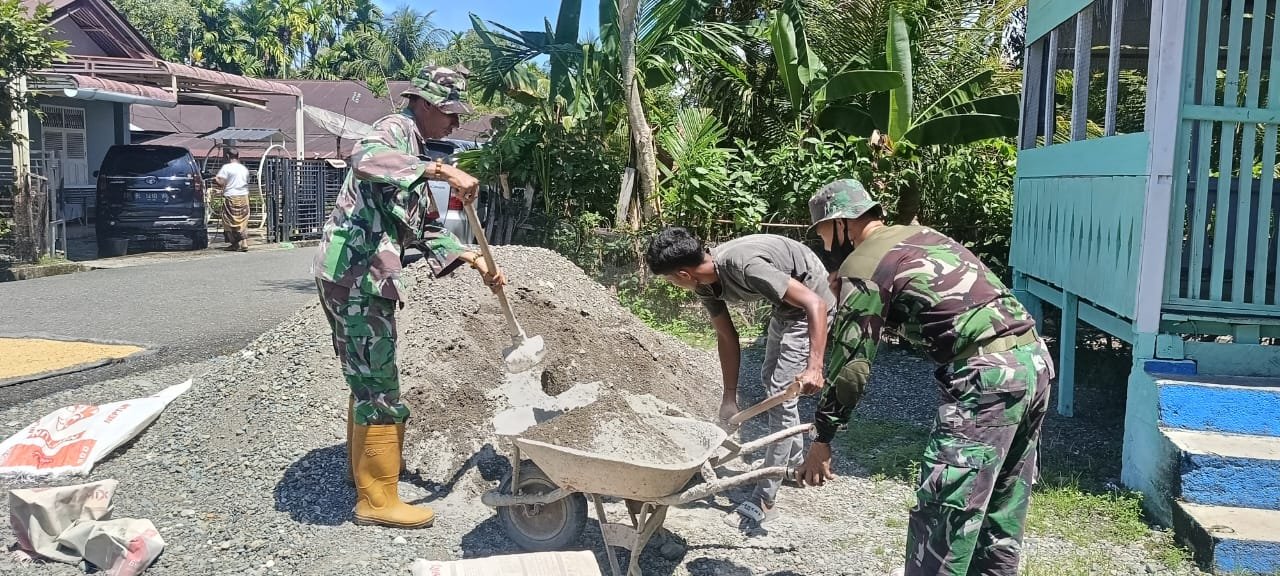 Pada Sabtu (7/3/2026), prajurit TNI bersama masyarakat terlihat bekerja bersama di berbagai sasaran kegiatan TMMD, baik pembangunan fisik maupun kegiatan nonfisik.