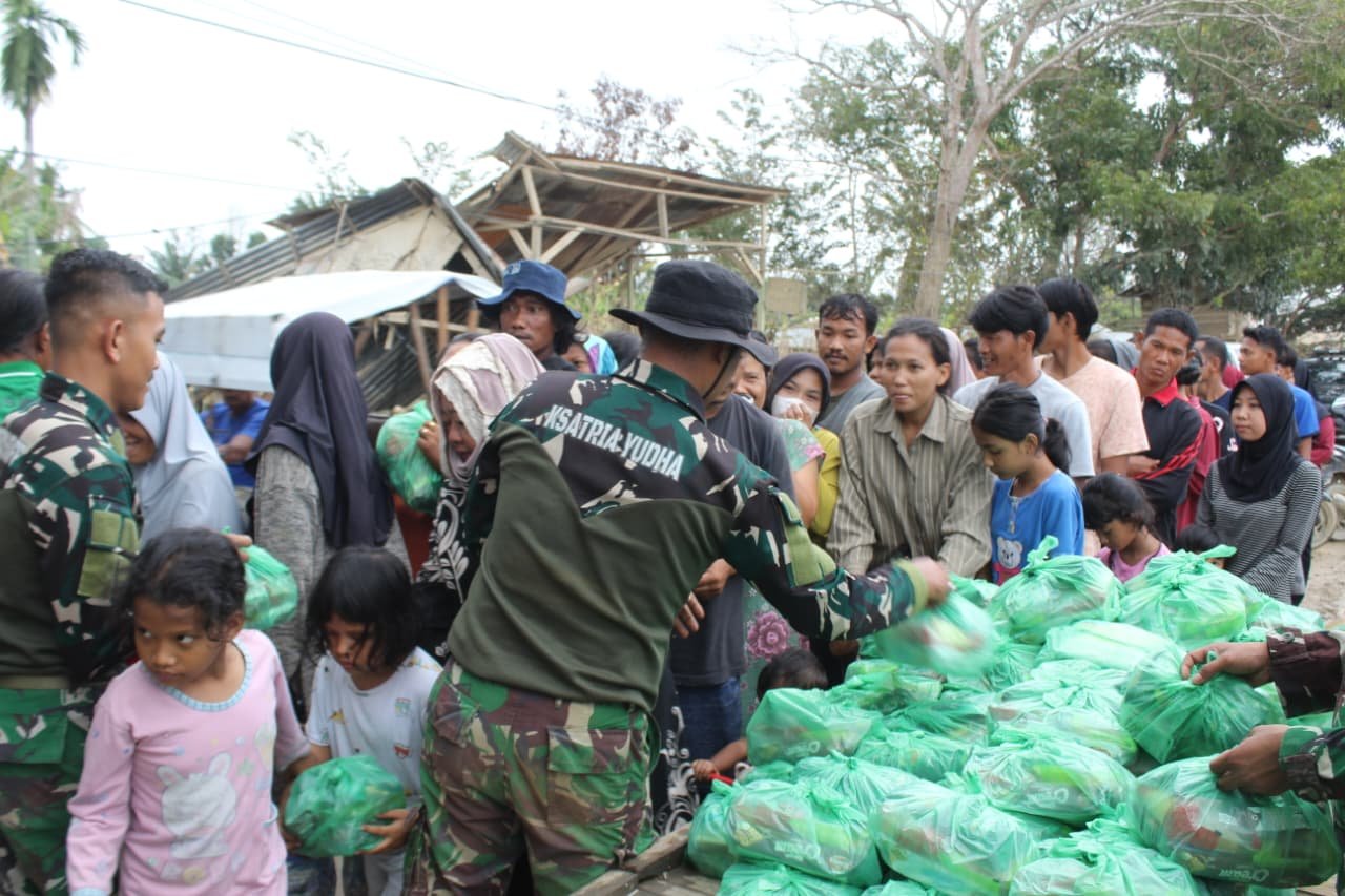 Kegiatan tersebut dilaksanakan dengan membagikan kebutuhan pokok kepada masyarakat yang terdampak banjir sebagai bentuk perhatian dan kepedulian TNI terhadap kesulitan yang dialami warga.