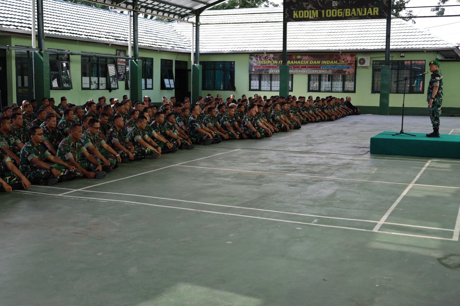 BANJAR — Komandan Kodim 1006/Banjar Letkol Inf Bambang Prasetyo Prabujaya, S.Hub.Int., M.Han., memberikan Jam Komandan kepada seluruh prajurit TNI dan PNS Kodim 1006/Banjar yang berlangsung di Aula Sabarataan, Kamis (4/9/2025).