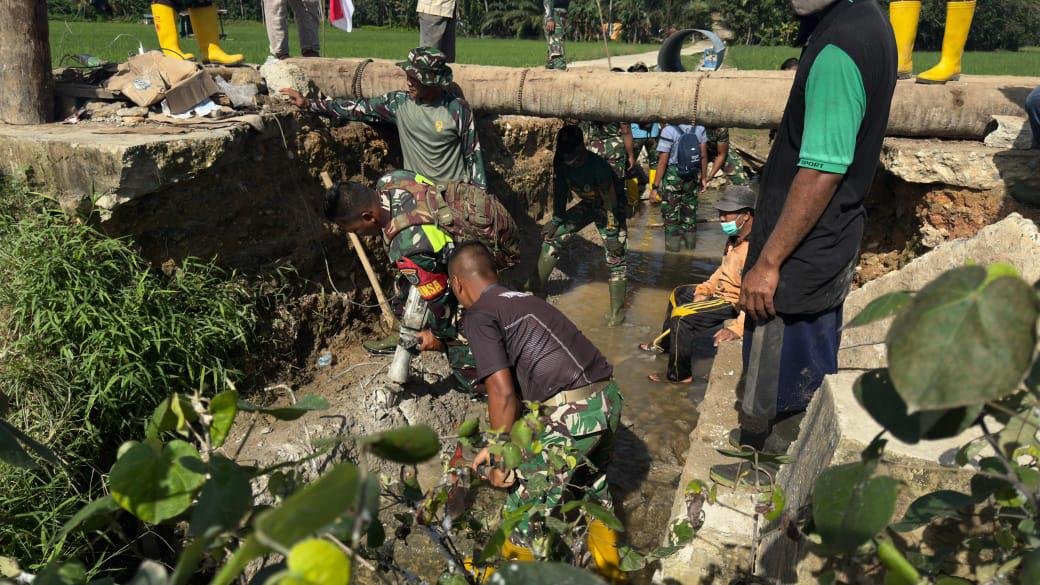 Aceh Tamiang – Prajurit Yonif 117/Ksatria Yudha melaksanakan kegiatan pembangunan Jembatan Armco di Dusun Mawar, Desa Suka Mulia, Kecamatan Rantau, Kabupaten Aceh Tamiang, sebagai bentuk kepedulian TNI AD dalam mendukung pembangunan infrastruktur serta meningkatkan kesejahteraan masyarakat, Minggu (11/01/2026).