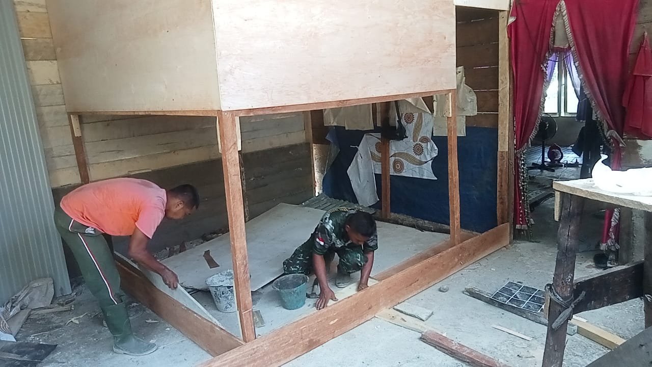 Rangka rumah milik Ibu Ani Sarlini mulai berdiri. Balok-balok kayu disusun rapi oleh Personel Satgas bersama warga setempat.