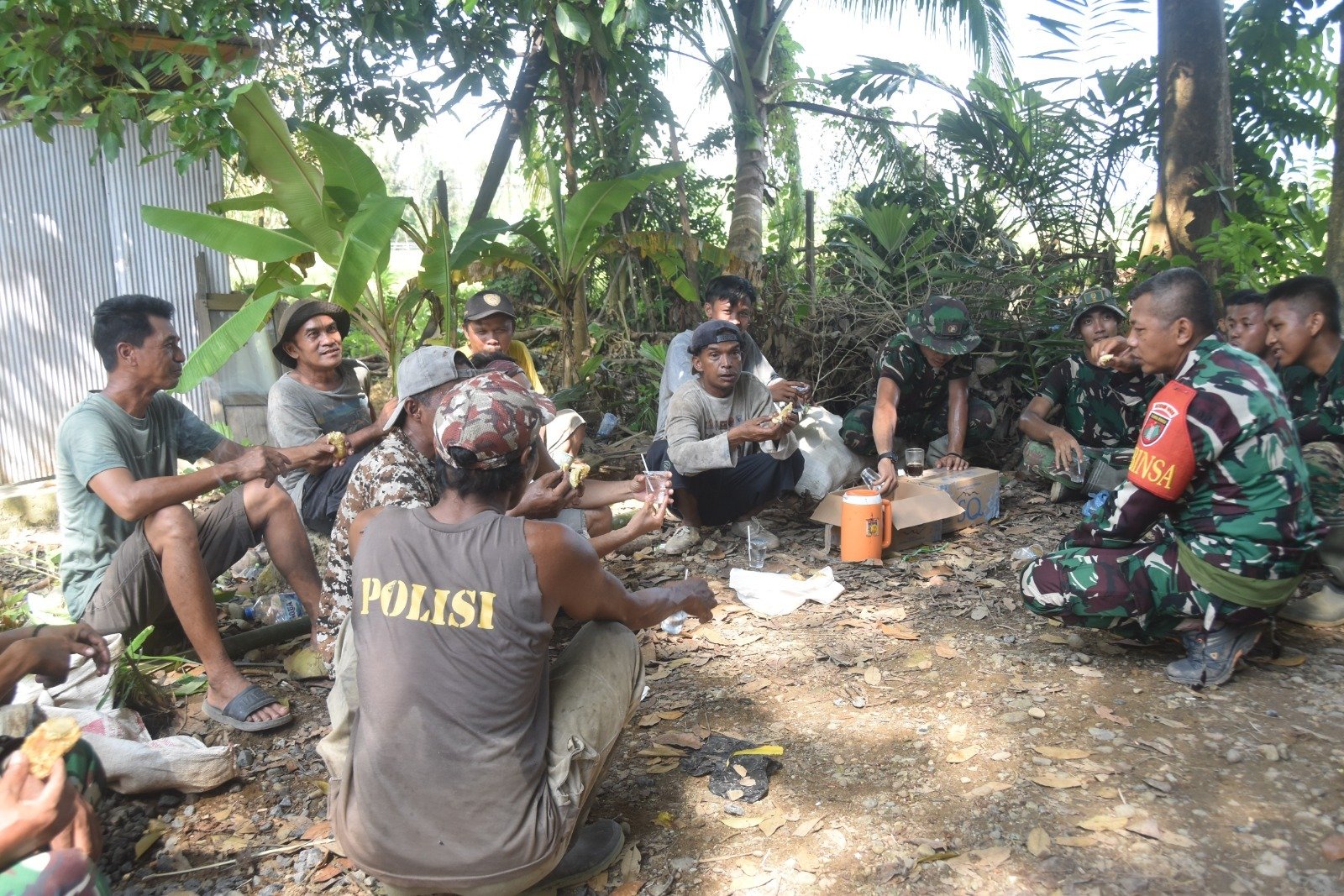 HULU SUNGAI SELATAN – Tak hanya saat bekerja melaksanakan perbaikan dan pengecoran peningkatan mutu jalan, kekompakan serta keakraban masyarakat bersama personel TNI Satuan Tugas (Satgas) TNI Manunggal Membangun Desa (TMMD) Ke-128 Kodim 1003/Hulu Sungai Selatan (HSS) sangat baik, seolah-olah tidak ada jarak sesuai dengan kalimat kemanunggalan TNI dengan rakyat dalam menyelesaikan permasalahan di kalangan masyarakat untuk mewujudkan kesejahteraan di wilayah terpencil.