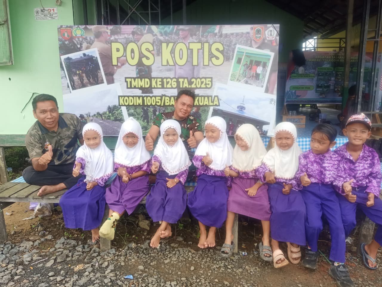 Dengan pakaian seragam ungu putih yang rapi, para bocah itu duduk berjajar sambil tersenyum malu-malu di samping anggota TNI. Pemandangan ini menjadi bukti nyata kedekatan antara Satgas TMMD dan warga sejak usia dini.