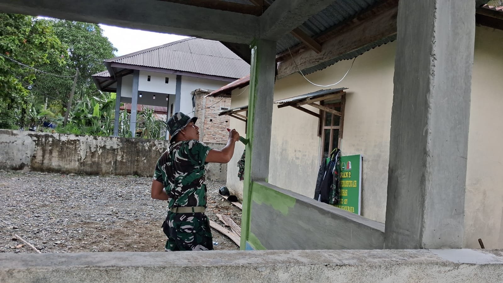 NAGAN RAYA – Suasana kebersamaan tampak di Desa Ujong Blang, Kecamatan Beutong, saat personel Satgas TNI Manunggal Membangun Desa Ke-127 Kodim 0116/Nagan Raya melakukan pengecatan dan pembersihan penampungan air bersih.