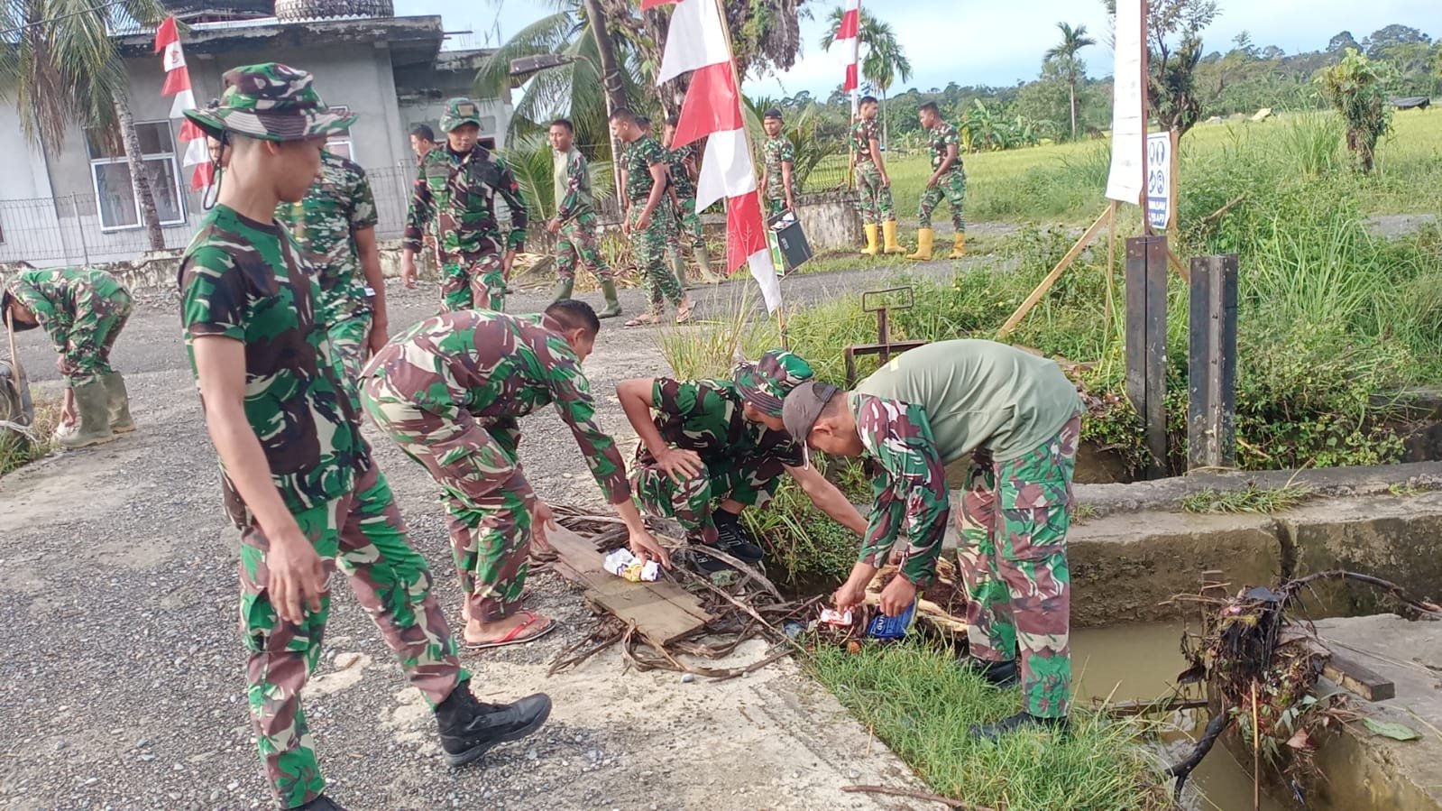 Meski memasuki hari Minggu, para prajurit tetap aktif melaksanakan pembersihan lingkungan di sekitar Pos Komando Taktis (Kotis) di Desa Ujong Blang, Kecamatan Beutong, Minggu (15/2/2026).