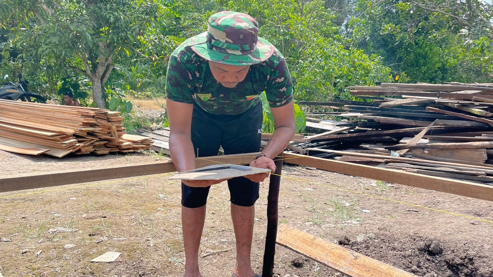 Minggu (12/10), meski di tengah hari libur, para prajurit tetap bersemangat melanjutkan tahapan penting berupa penarikan benang pancang, yang menjadi patokan utama dalam menentukan posisi dan ukuran bangunan.