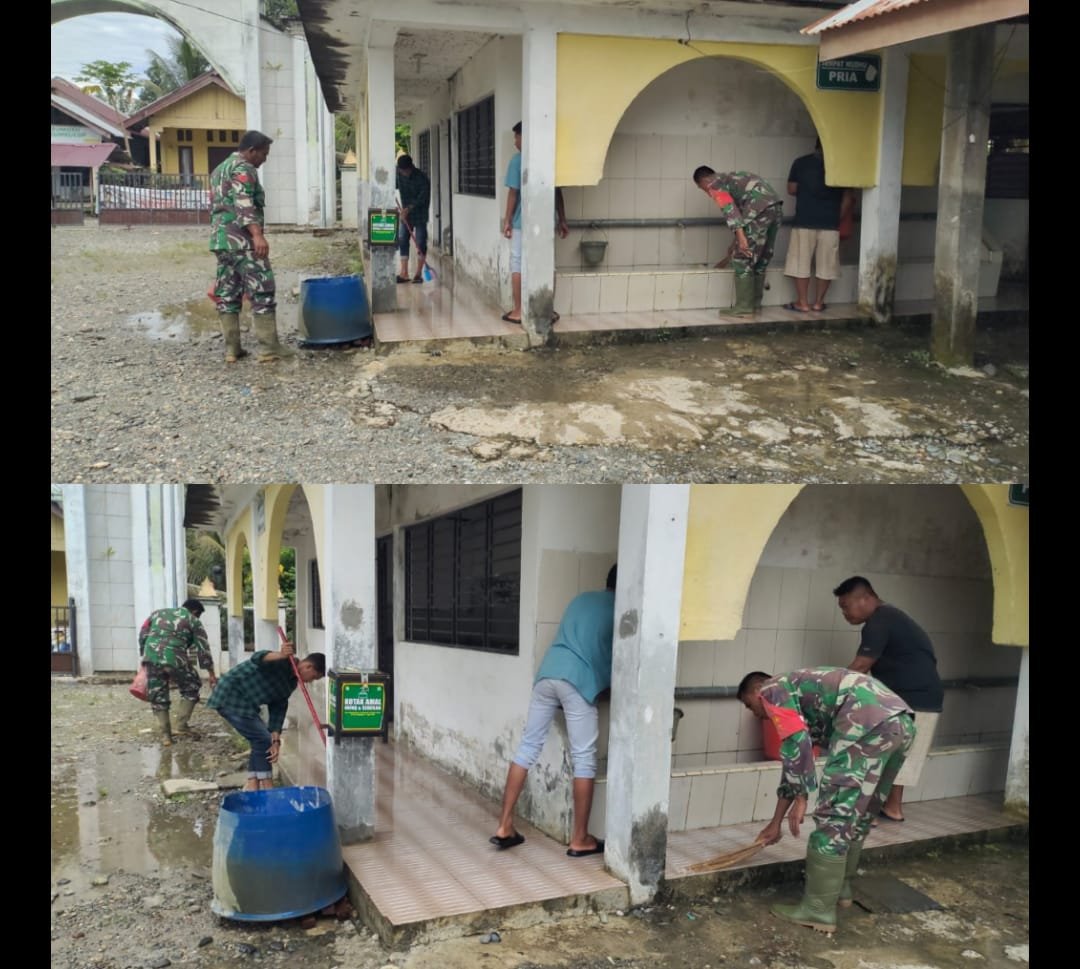 ACEH BARAT – Sebagai aparat teritorial yang memiliki peran penting dalam pembinaan wilayah, Babinsa Posramil 05/Pante Ceureumen Kodim 0105/Aceh Barat kembali menunjukkan kepeduliannya terhadap masyarakat dengan melaksanakan kegiatan gotong royong bersama warga membersihkan Masjid Babul Taqwa di Desa Meunuang Kinco, Kecamatan Pante Ceureumen, Kabupaten Aceh Barat, Selasa (16/12/2025).