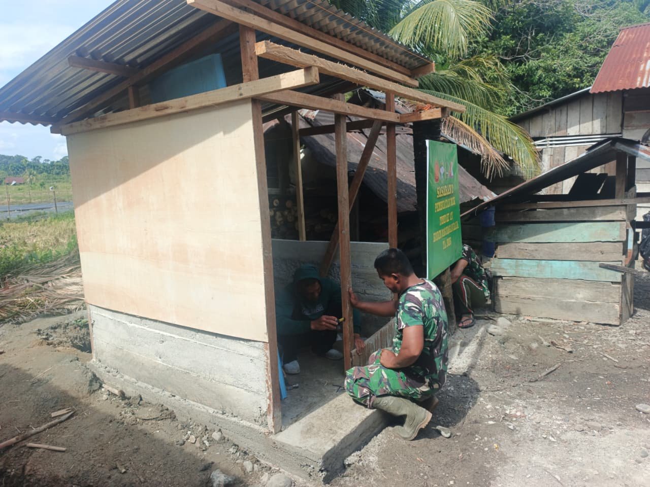 Di lokasi pengerjaan, personel Satgas TMMD tampak teliti menyusun rangka demi rangka. Kayu dan material lainnya dipasang secara hati-hati, layaknya merangkai tulang yang akan menguatkan tubuh bangunan. Meski pengerjaan dilakukan secara bertahap, hasilnya mulai terlihat nyata—sebuah bangunan MCK berdiri kokoh dan perlahan menampakkan bentuk utuhnya.