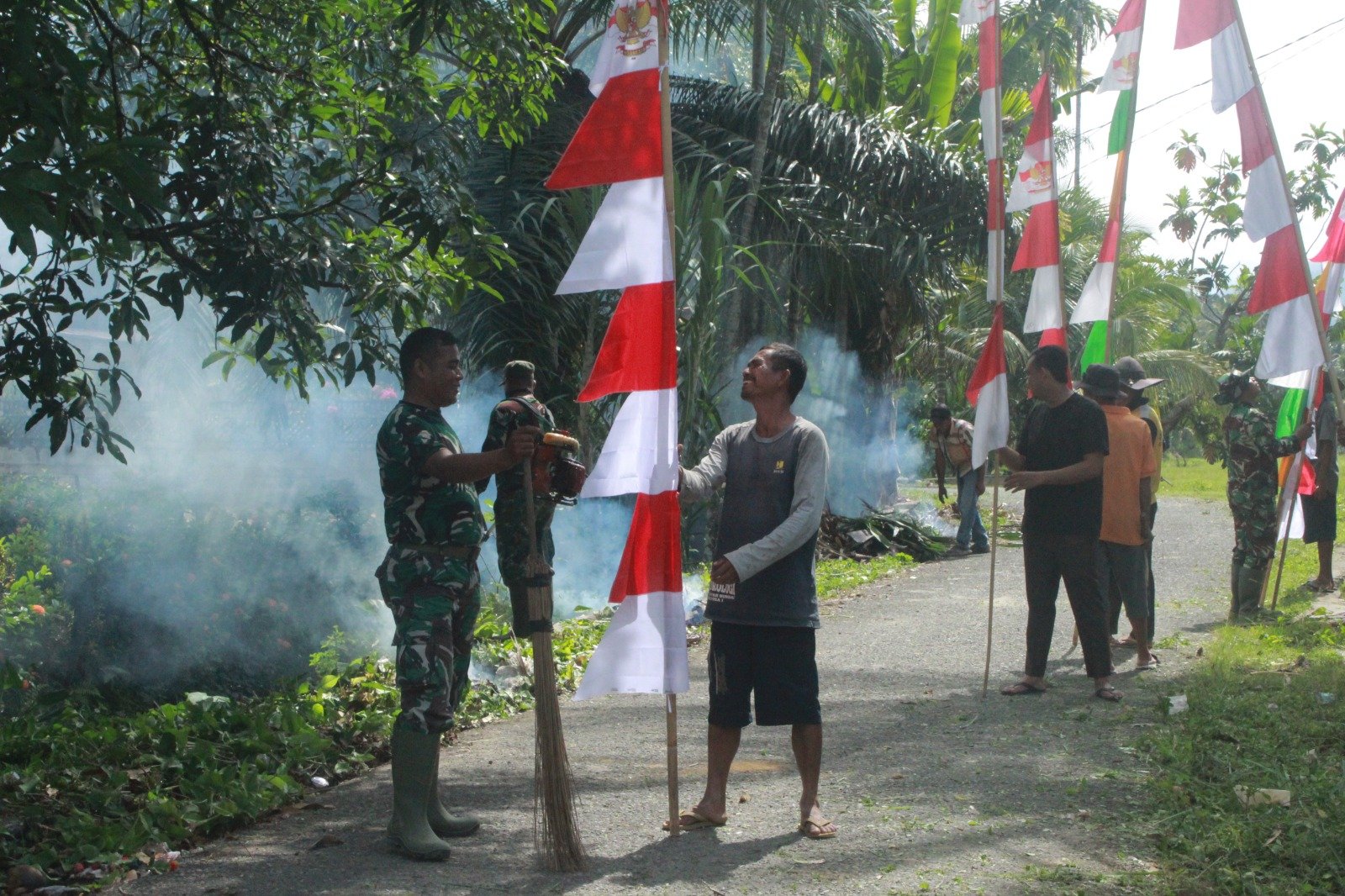 Hari Selasa (10/3/2026), anggota Satgas TMMD bersama masyarakat terlihat kompak memasang umbul-umbul di berbagai titik desa. Kebersamaan yang selama ini terjalin dalam pembangunan infrastruktur kini kembali terlihat dalam persiapan penutupan kegiatan.
