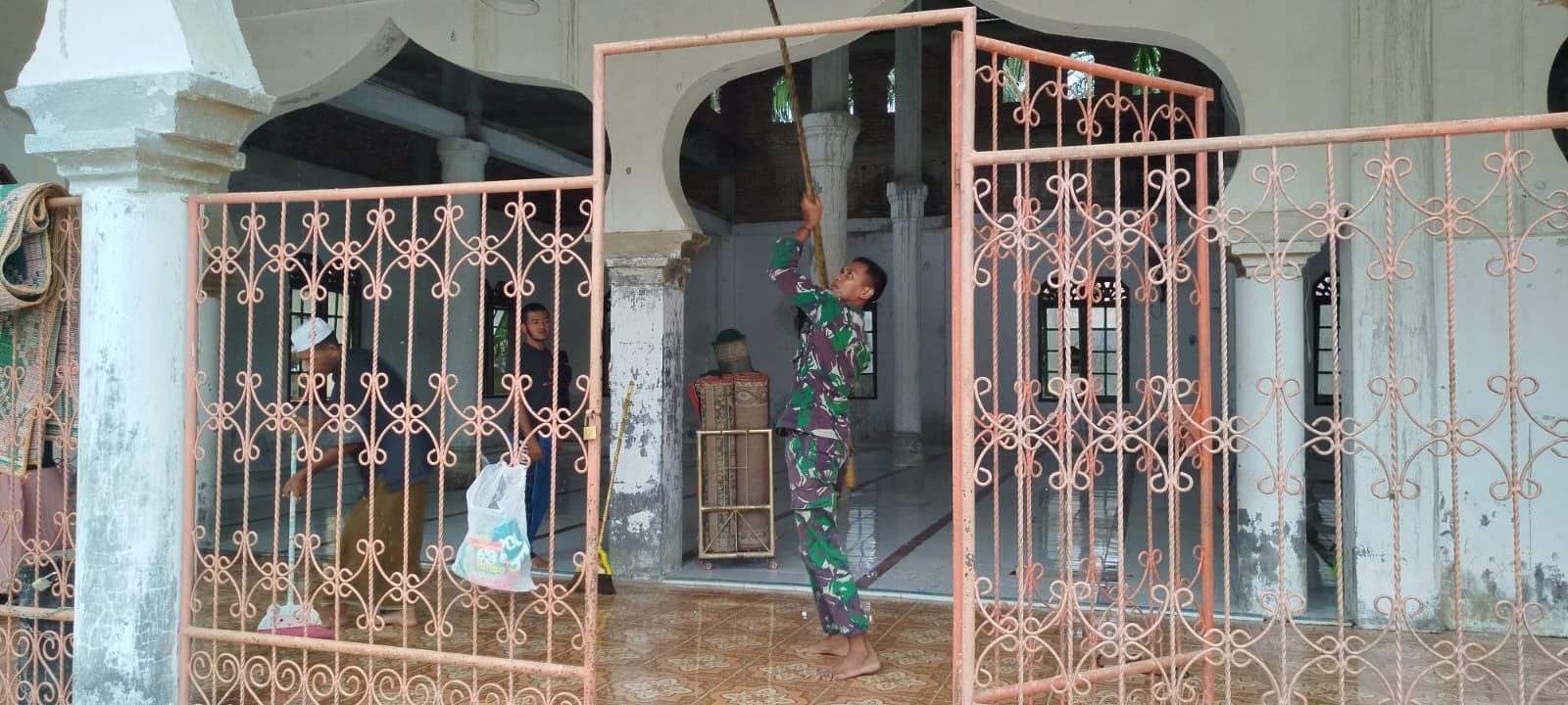 Sejak pagi, halaman masjid mulai ramai. Prajurit TNI dan warga terlihat bekerja bersama tanpa sekat. Ada yang menyapu lantai, membersihkan rak Al-Qur’an, hingga mengangkat sampah di sekitar halaman masjid.