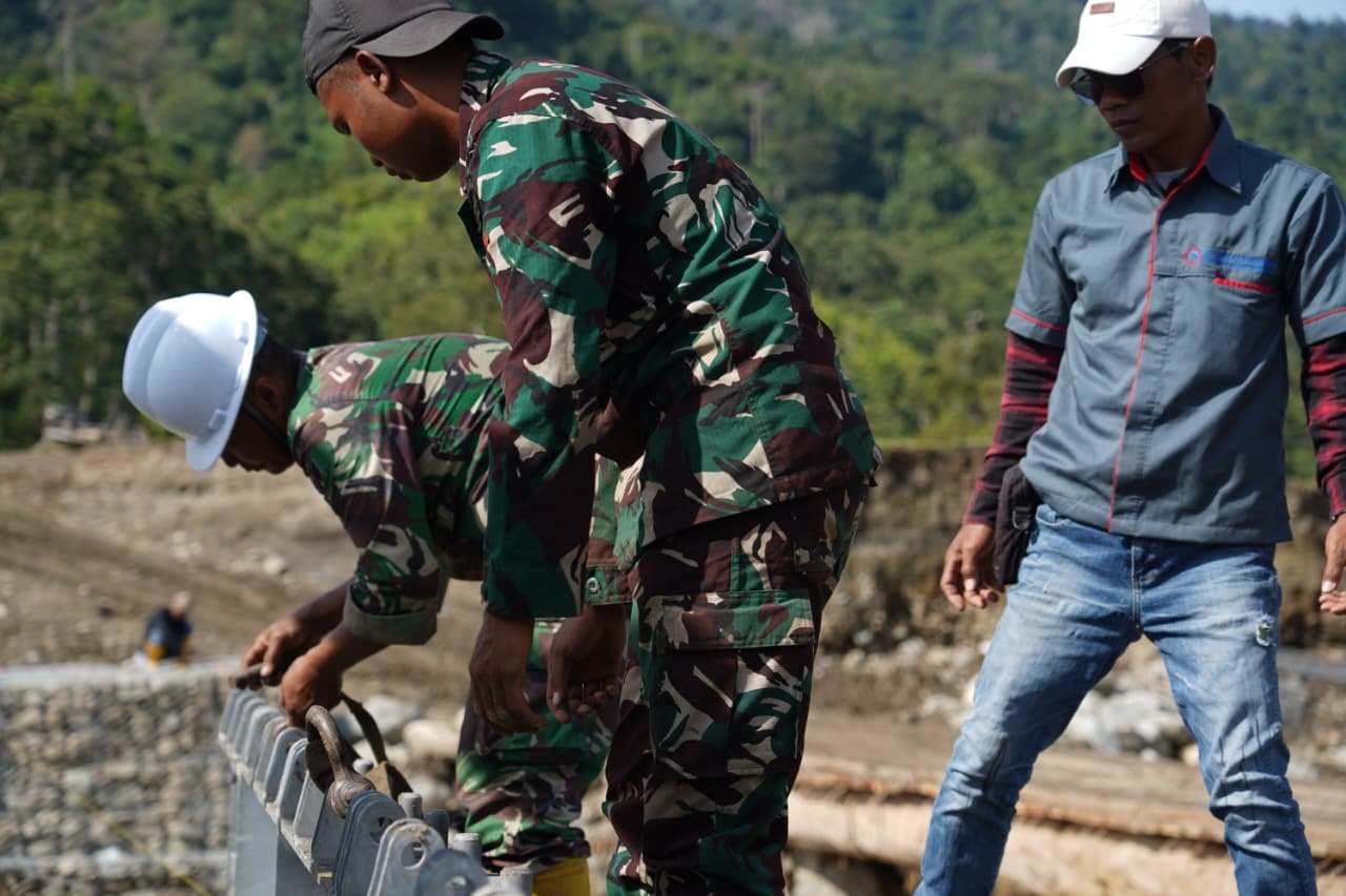 Dengan penuh semangat pengabdian, prajurit TNI bersama unsur terkait bahu-membahu merangkai material jembatan Bailey di lokasi. Kehadiran Dandenzibang 1/IM di lapangan menjadi motivasi tersendiri bagi seluruh personel yang terlibat dalam pekerjaan tersebut.