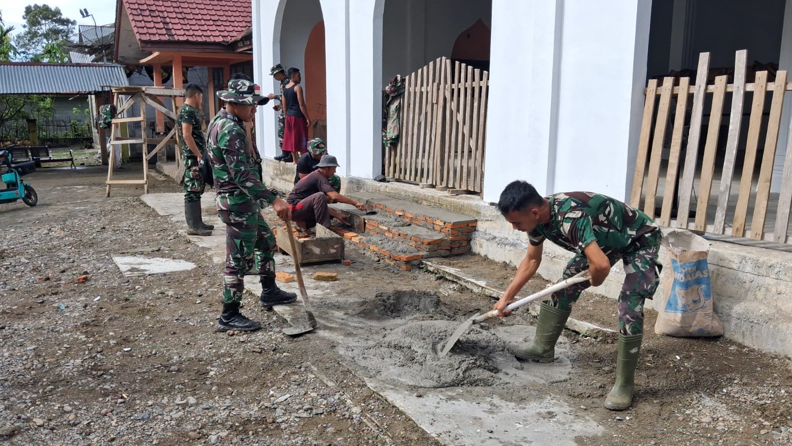 Sejak pagi, suasana gotong royong mengalir seperti arus sungai yang tak pernah berhenti. Prajurit dan warga bahu-membahu menyiapkan adukan semen, mengecat dinding, hingga merapikan bagian depan Mushalla. Tidak ada sekat antara seragam loreng dan pakaian warga, semuanya larut dalam tujuan yang sama.