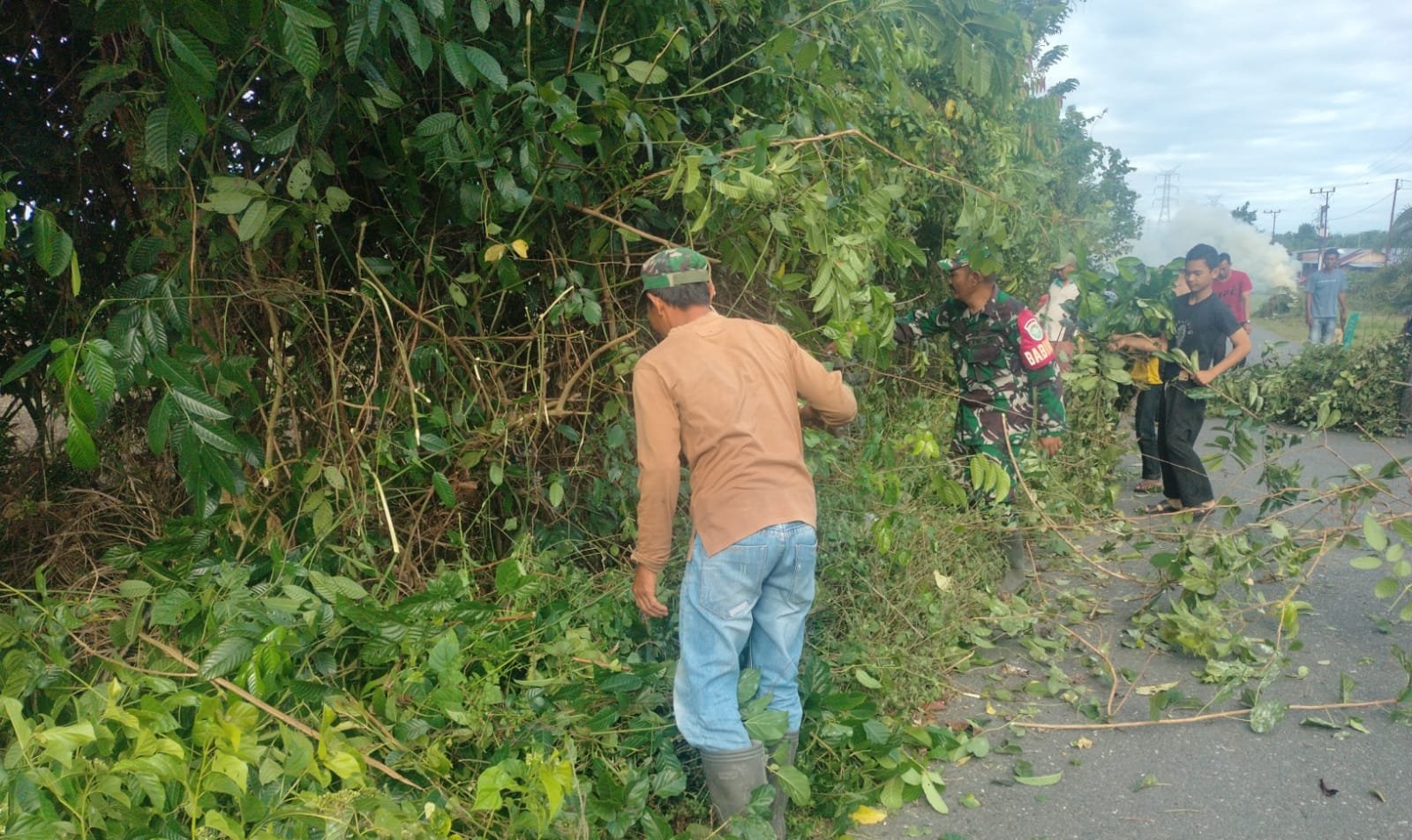Potret di lokasi menunjukkan Babinsa dan masyarakat memfokuskan kegiatan gotong royong pada pembersihan rumput liar serta pemangkasan dahan-dahan yang rimbun di kanan kiri jalan utama.