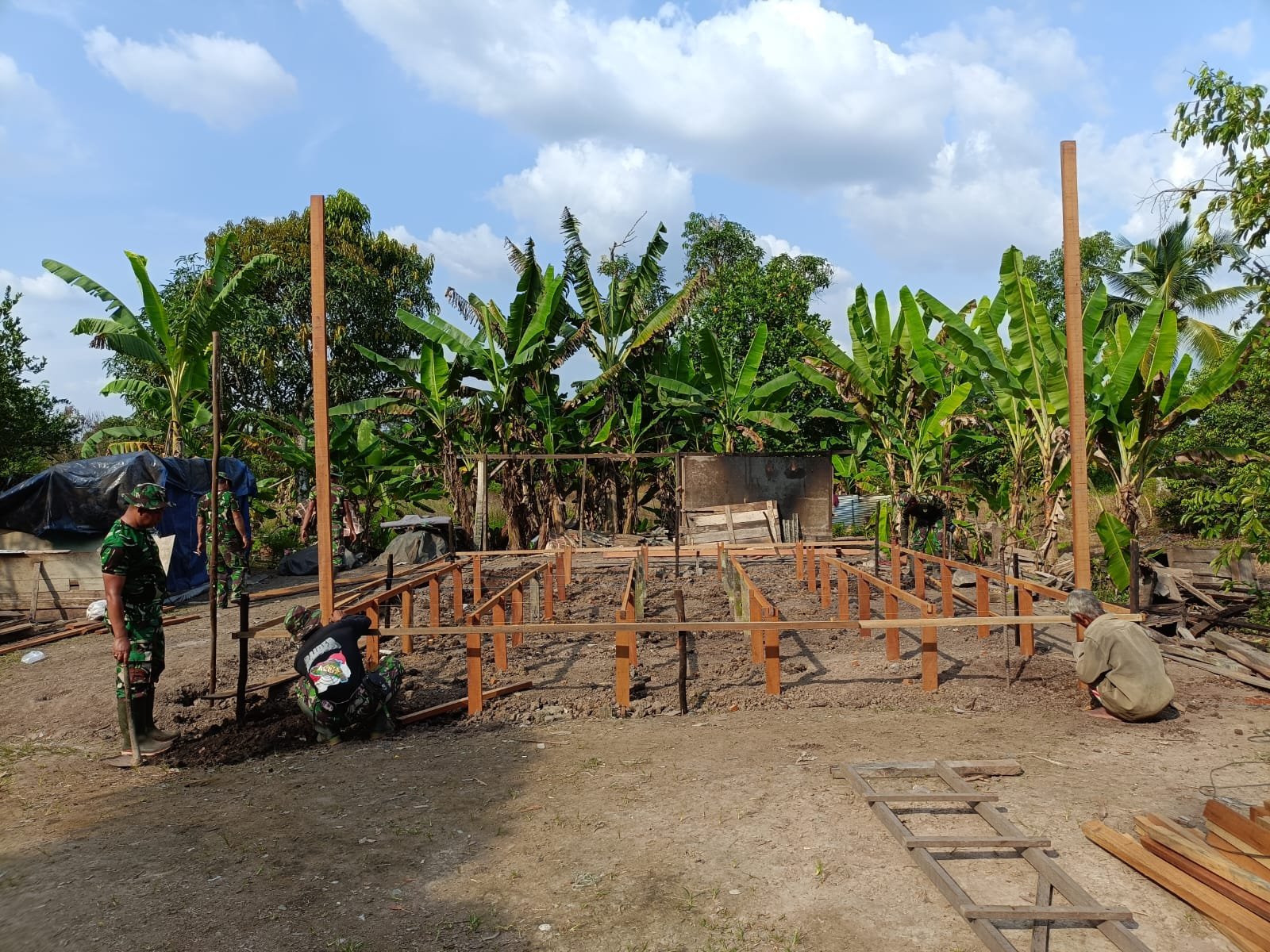 Berdasarkan laporan yang diterima dari Peltu Hari Maladi pada Jumat (10/10/2025), pekerjaan di lokasi tersebut meliputi pemasangan tongkat yang telah mencapai 80 persen, pemasangan glagar 40 persen, dan tiang utama yang juga sudah 40 persen terpasang.