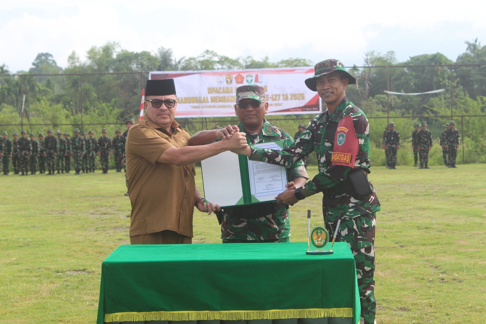 Upacara berlangsung khidmat dengan rangkaian kegiatan mulai dari penghormatan pasukan, laporan komandan upacara, pembacaan laporan hasil TMMD hingga penandatanganan berita acara serah terima hasil program kepada Pemerintah Kabupaten Nagan Raya.