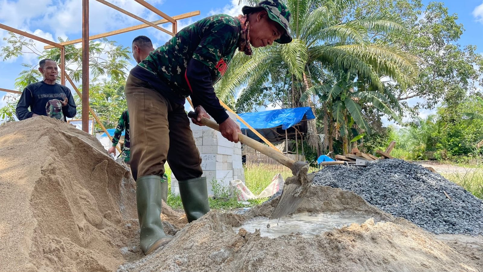“Nampak jelas semangat gotong royong di lapangan. TNI dan masyarakat saling bahu membahu, mulai dari mengaduk semen, menata bata, hingga mendirikan tiang bangunan,” ujarnya.