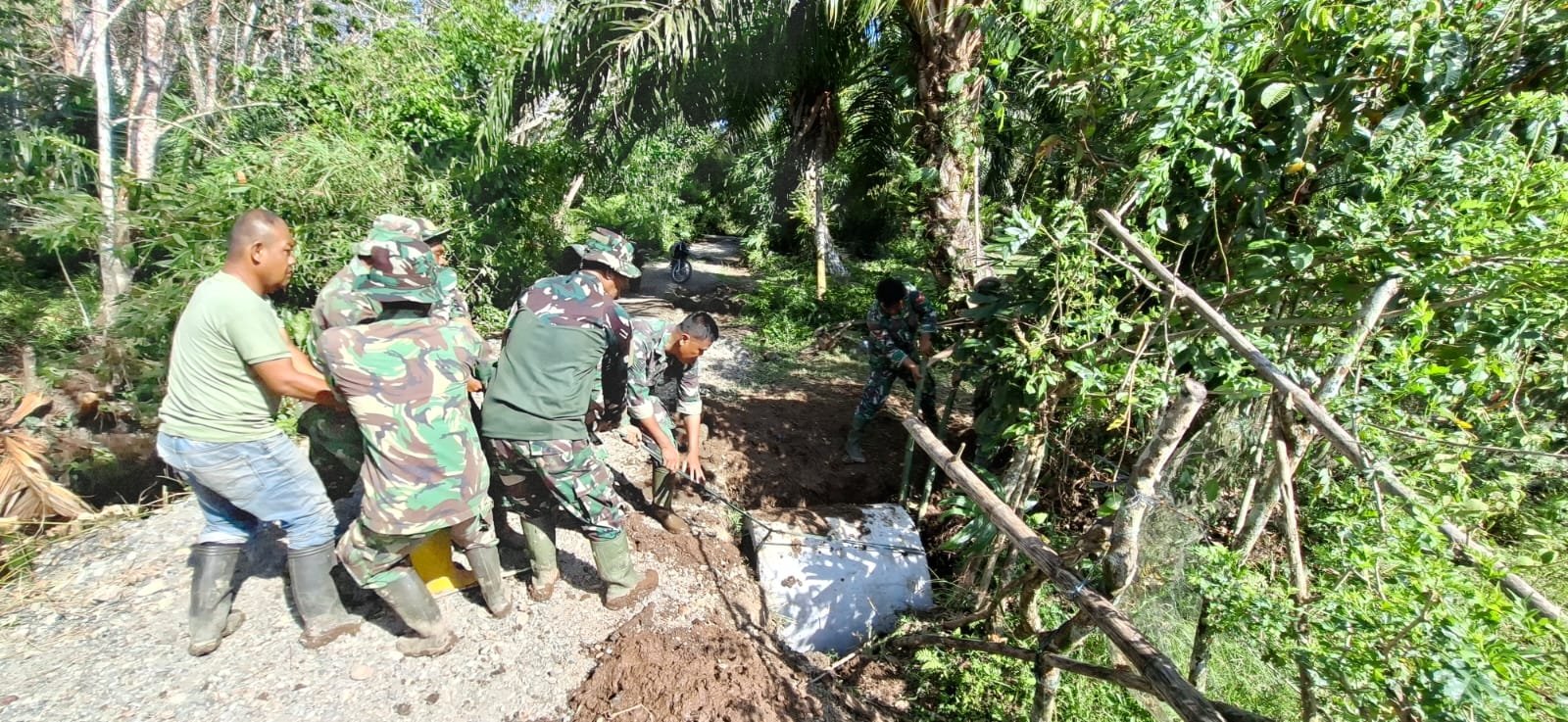 Dengan penuh semangat, personel TNI dan warga tampak kompak menurunkan cincin beton, mengatur posisi pemasangan, hingga merapikan badan jalan. Kegiatan ini bertujuan untuk memastikan aliran air menuju lahan pertanian dan perkebunan warga tetap lancar.