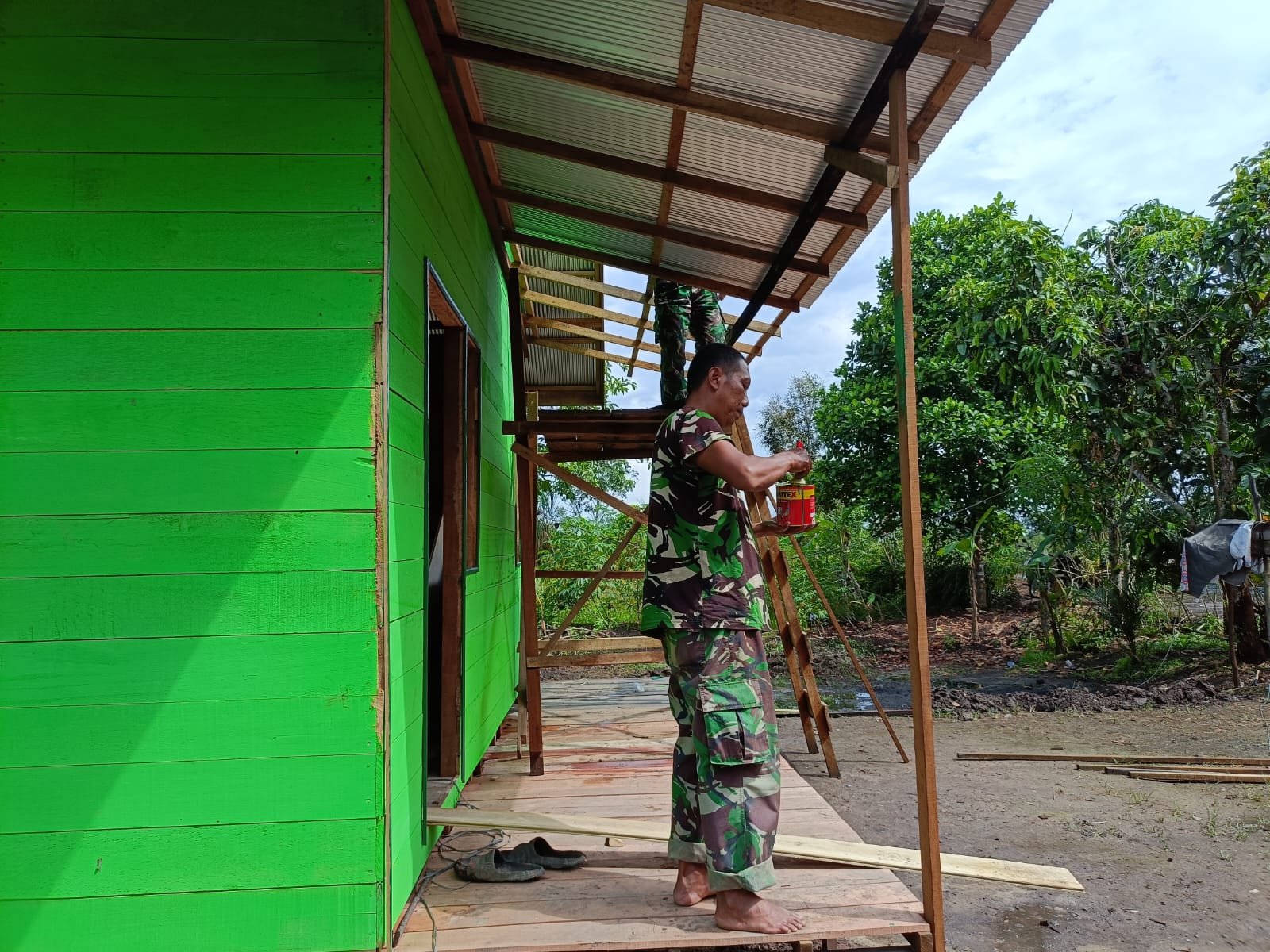 Dengan senyum ramah, Kai Salamun sesekali ikut menyapa para anggota Satgas yang tengah sibuk bekerja. Kamis (23/10), mereka tengah memasang skat kamar menggunakan papan klasiboard, memperbaiki atap teras, serta mulai melakukan pengecatan bagian luar rumah.