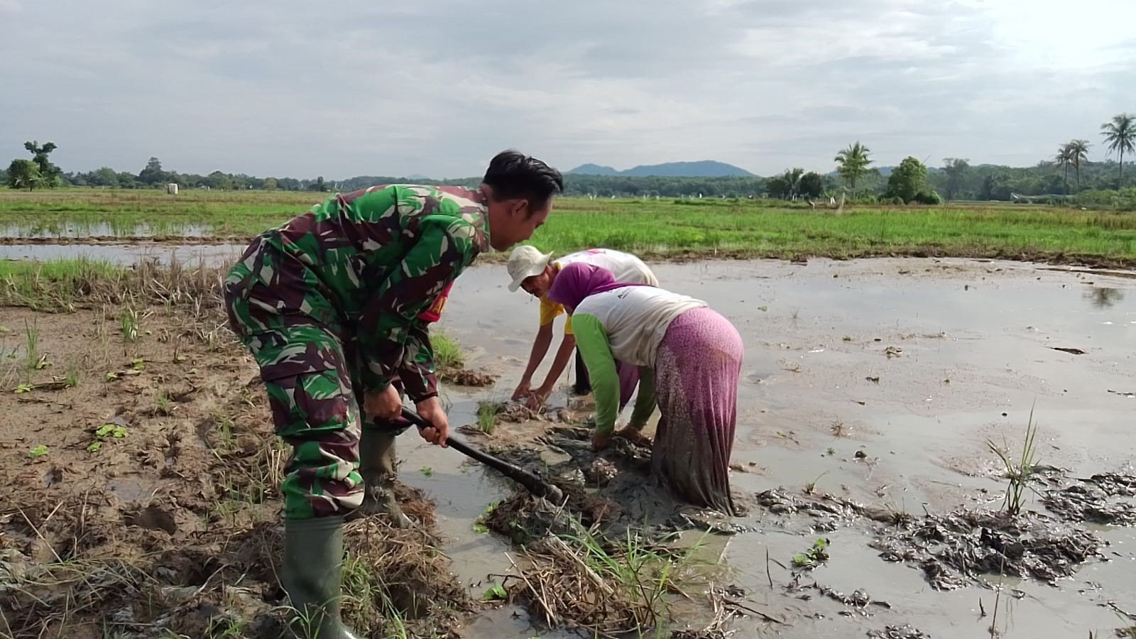 HULU SUNGAI SELATAN – Sebagai bentuk dukungan dan komitmen dalam menyukseskan ketahanan pangan, Bintara Pembina Desa (Babinsa) Koramil 1003-01/Telaga Langsat Sertu Nanang S turun langsung kesawah menanam padi bersama petani yang merupakan warga binaan guna mempercepat proses tanam serta memberikan semangat dan mempererat hubungan antara TNI (Babinsa) dengan masyarakat binaan. Jumat (5/12/25)