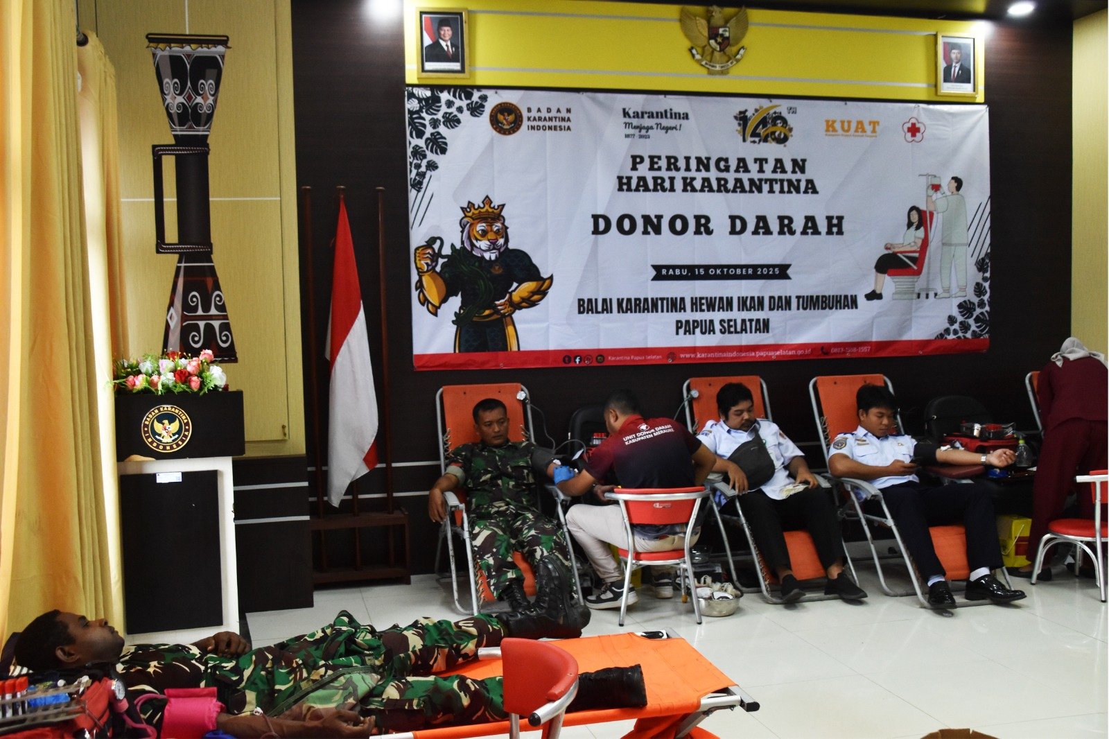 Kegiatan yang dipimpin langsung oleh Kepala Balai Karantina Hewan, Ikan, dan Tumbuhan Papua Selatan, Bapak Ferdi, S.P., M.Si., diikuti sedikitnya 100 orang peserta donor dan tamu undangan dari berbagai instansi TNI, Polri, serta instansi Pemerintah Daerah.
